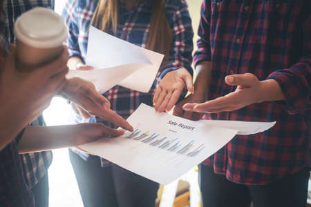 Close-up of business colleagues examining financial report and discussing it together standing at office
