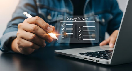 A person's hand holds a stylus, interacting with a digital survey form displayed on a transparent screen next to a laptop.