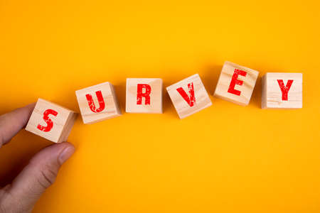 Selective focus of wooden people with a wooden cube written with Survey on gray background.