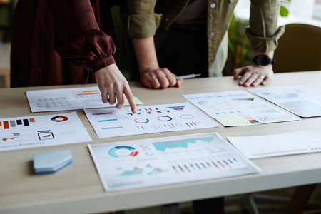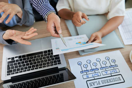 Close-up of businesswoman holding paper and pointing at chart on it and discussing with her colleague during a meeting at the table