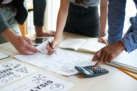 close up hand creative designer team casual meeting and brainstroming on desk with paperwrok and online data on laptop in meeting room at modern office.business planning concept