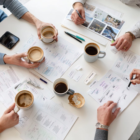 Diverse hands actively participate in a collaborative brainstorming session, charting ideas and strategies on a large paper, surrounded by colorful sticky notes.