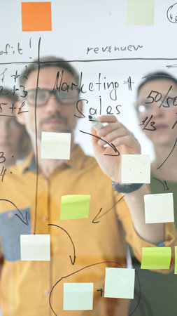 Professional team strategizing, writing collaborative notes on glass board, mapping innovative project workflow with marker