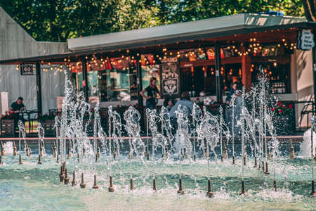 summer cafe in the background, blurry. fountain and splashes in the foreground. coolness concept in hot summer