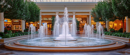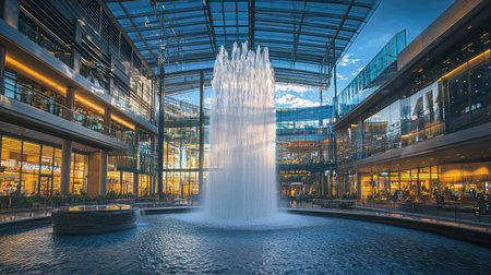 This vibrant urban scene showcases a spectacular water fountain in a modern shopping center, surrounded by stylish architecture and evening light. A perfect blend of nature and design.