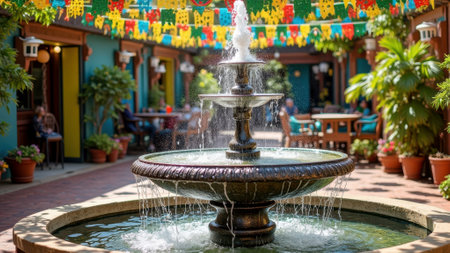 Vibrant fountain in mexican courtyard with colorful papel picado banners. That the image is generated using AI.