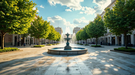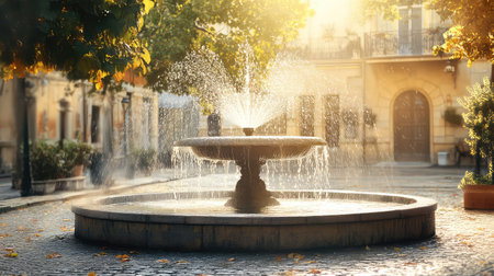 This stunning image captures a serene fountain amidst lush trees in a tranquil courtyard, illuminated by warm sunlight, creating a peaceful ambiance.