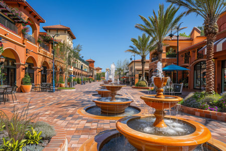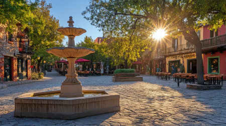 A city street featuring a fountain in the center of a Mediterranean-inspired plaza, A Mediterranean-inspired plaza with clay-tiled fountains and sun-soaked terraces