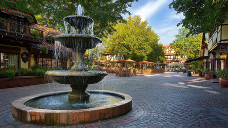A classic town square with a historic fountain, cobblestone pavement, and cheerful outdoor seating.