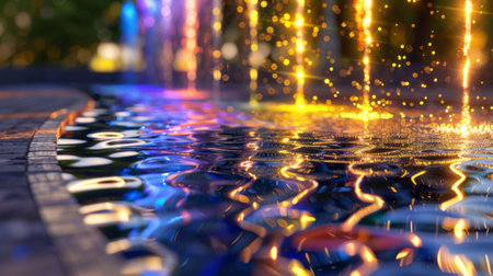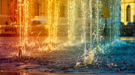 Colorful stream of water in a public fountain, using the architecture and details of the background. generative ai