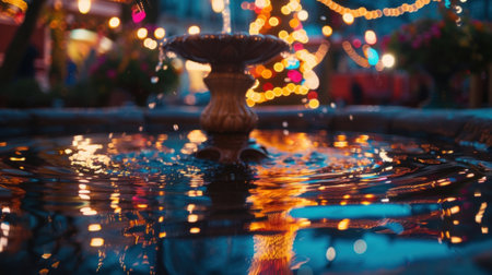 Blurred reflections of the festive decor and activities in a nearby water fountain