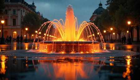Captivating illuminated fountain landmark with motion and water feature at night.