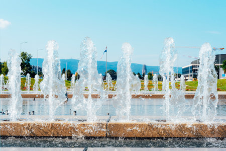 The image captures a fountain in a public space, featuring multiple water jets against a mosaic surface. The composition showcases a range of colors and textures. Soft focus effects create a blurred background, suggesting a lively setting with people. Suitable for various visual projects and potential commercial applications.