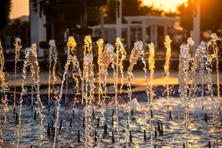 Beautiful fountain in the resort town in the sunset light. Modern public space. Summer concept, background