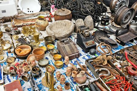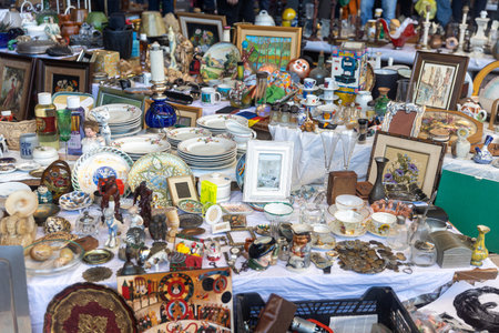BRUSSELS, BELGIUM - DECEMBER 18, 2018: Antiquities for sale at Marolles Flea Market at the Jeu de Balle square in Brussels, capital of Belgium