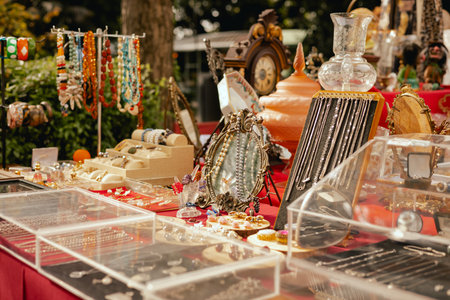 An assortment of antique jewelry pieces, including necklaces, brooches, and rings, displayed at a vintage market. Perfect for themes related to antiques, collectibles, and historical items.