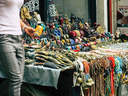 Kathmandu Nepal August 31, 2018 Closeup of decorative objects sold in a souvenirs shop at Thamel district in Kathmandu in the afternoon