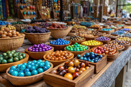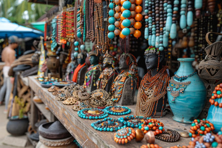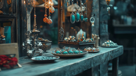 A bustling market scene with traditional jewelry and decorative items on display, featuring vibrant colors, intricate designs, and a variety of cultural artifacts.