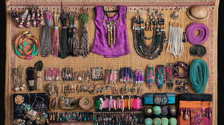 Explore this vibrant collection of artisan jewelry and accessories displayed against a woven background, highlighting unique craftsmanship and cultural richness.