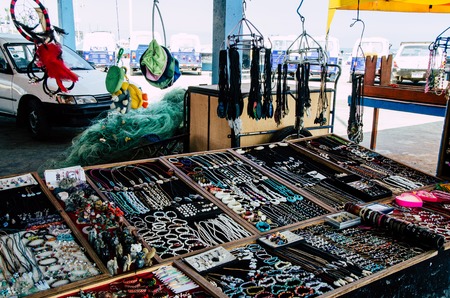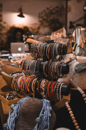various handmade silver brass form apparel accessories sell in outdoor street market fair store.