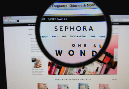 LISBON, PORTUGAL - JANUARY 30, 2014: Photo of Sephora homepage on a monitor screen through a magnifying glass.