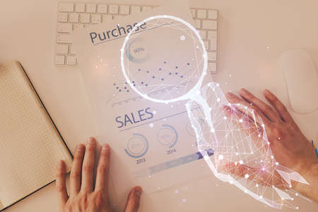 Magnifying glass on top of laptop with customizable space for text or ideas. Copy space.