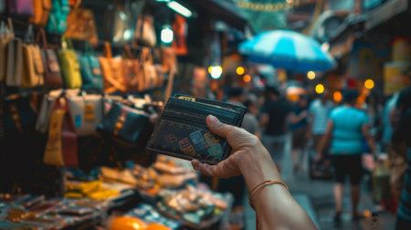 A close-up of a hand snatching a wallet from an open purse in a crowded market