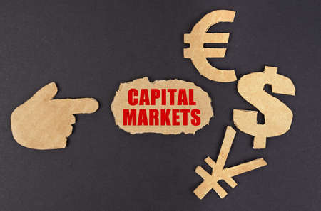 Economy and finance concept. On a black surface, a figure of a hand, money symbols and torn cardboard with the inscription - CAPITAL MARKETS