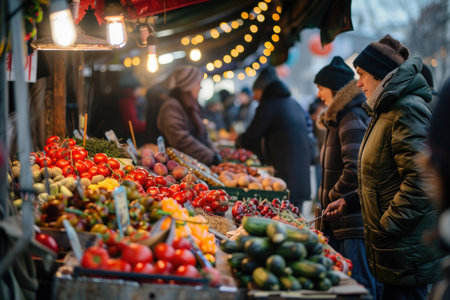 People browsing a vibrant outdoor market with fresh vegetables, dressed warmly for the cold weather