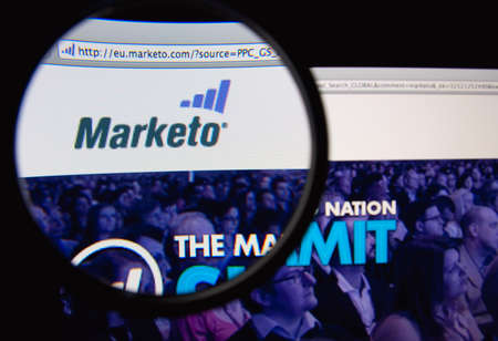 LISBON, PORTUGAL - FEBRUARY 19, 2014: Photo of Marketo homepage on a monitor screen through a magnifying glass.