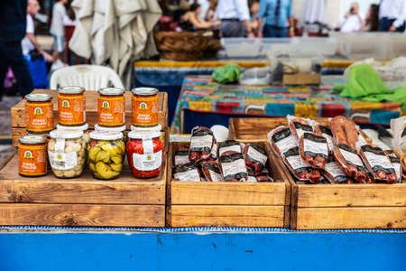 Naples, Italy - September 9, 2019: Display with typical food products on a street food market with people around in Via Toledo, Naples, Italy