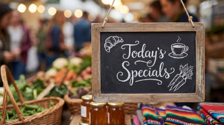 Hanging chalkboard sign displaying 'Today's Specials' with chalk drawings of a croissant, coffee, and carrots. Blurred market background features produce baskets, honey jars, colorful textiles.