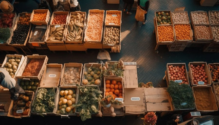 A diverse group of individuals gathered around a table abundantly filled with various fresh fruits and vegetables, A bustling outdoor market from a bird's eye perspective, AI Generated