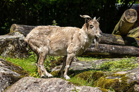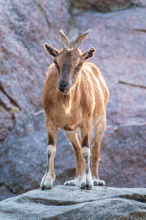 Markhor female on the rock. Latin name - Capra falconeri. Wild goat native to Central Asia, Karakoram and the Himalayas