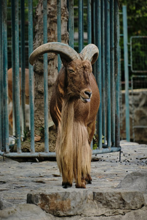 A Barbary sheep with long beard and large horns standing near bars at Belgrade Zoo
