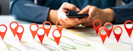 Woman hand using mobile phone and tablet with location pin on the map