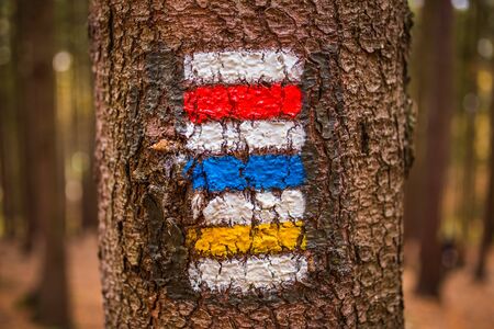 Touristic sign or mark on tree next to touristic path with nice autumn scene in background. Forrest trail.