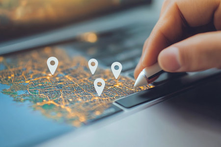 Innovative digital hand setting points on a map, representing GPS, AI logistics, and transport planning for new office locations