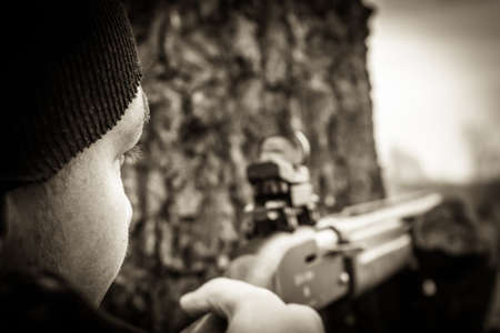 Hunter man with gun aiming and prepared to make a shot during hunting