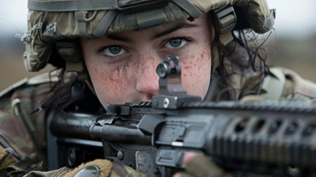 A female soldier inspecting her firearm, her face full of determination
