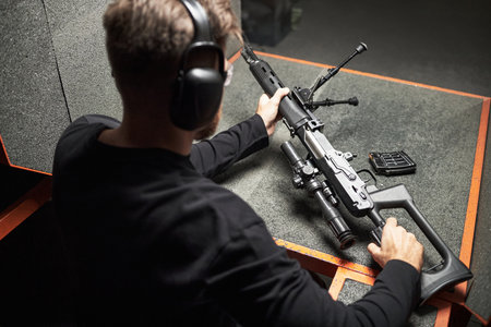 Rear view of man wearing protective earmuffs sitting at shooting range table holding sniper rifle preparing for target practice with ammunition magazine