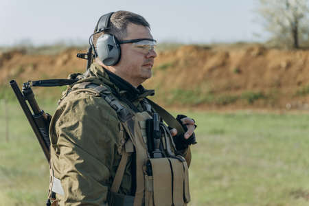 armed young white man in military uniform wearing headphones and glasses at the training ground