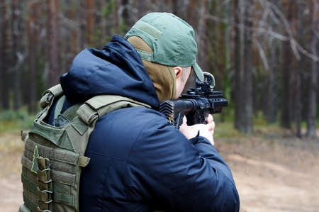 Courageous click pro soldier passionately aiming a rifle . High quality photo
