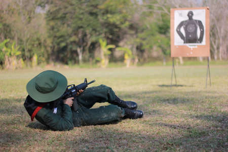 Focused soldier at ground level stance aiming using target scoop . High quality photo