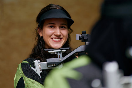 Smiling woman athlete aiming rifle, precision shooting sport. Competitive female shooter with air rifle, focus and determination, wooden background, indoor shooting range, sportswoman.