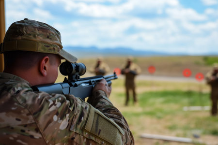 Focused soldier takes aim with a rifle during a training exercise, demonstrating precision and concentration