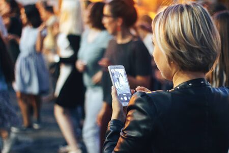 Woman taking pictures using smartphone or filming video of models on catwalk in city
