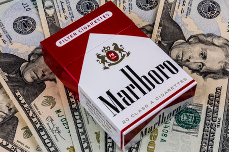 Indianapolis - Circa August 2016: Marlboro Cigarettes and Twenty Dollar Bills Representing the High Costs of Smoking. Marlboro is a product of the Altria Group VII