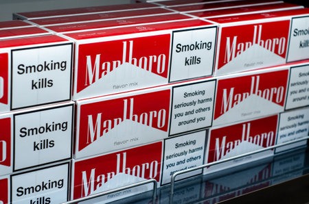 Muscat, Oman - January 19, 2020: Cigarettes department at a duty free segment store with many big packs of Marlboro on sale on a shelf in shop airport