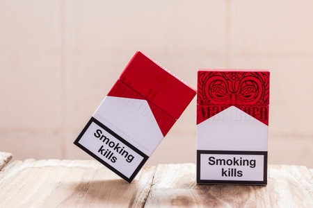 Cigarette packs neatly arranged on a clean surface in a minimalist setting